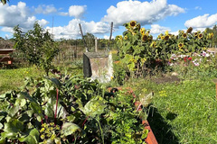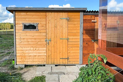 Zagospodarowany ogródek, nasadzenia (drzewka owocowe), wędzarnia oraz dwa drewniane budynki gospodarcze.