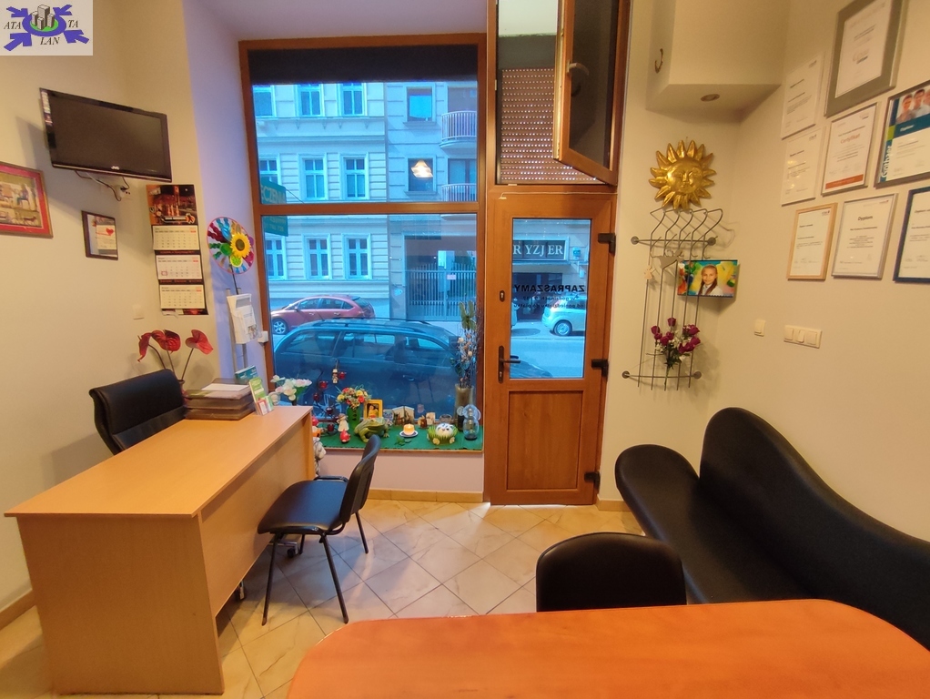 Lokal posiada własne wejście bezpośrednio z ulicy oraz dużą - ponad siedmiometrową witrynę. Lokal w ciągu ostatnich lat przeszedł generalny remont (ostatnie prace remontowe rok temu) i oferowany jest do sprzedaży w bardzo dobrym standardzie. W głównym pomieszczeniu ulokowane są dwa stanowiska biurowe (biurka plus fotele i krzesła) oraz mini poczekalnia gdzie znajduje się sofa. Tylna część lokalu to zaplecze socjalne, w którym znajdują się osobna toaleta z umywalką oraz aneks kuchenny (m.in. zlew, mikrofala i czajnik elektryczny) zasłonięty przesuwanymi szklanymi drzwiami. Dodatkowo za jednym z biurek usytuowane są kręcone schody, którymi wchodzimy na antresolę o powierzchni około 7m2 (nie wliczona w powierzchnię użytkową lokalu). Antresola jest częściowo przeszklona ozdobnymi luxferami.