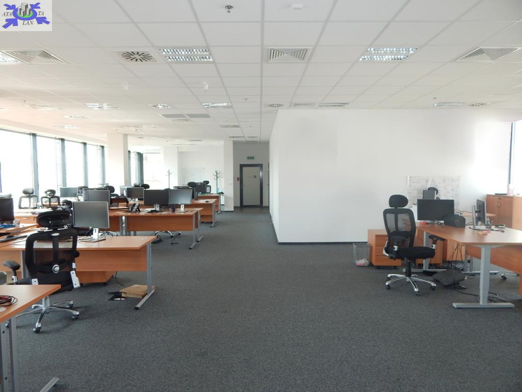 Na podłogach biura wykładzina przemysłowa (pod spodem podniesiona tzw. podłoga techniczna z puszkami podłogowymi), sufity podwieszane z oświetleniem rastrowym.