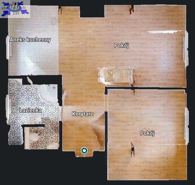Na pierwszym poziomie znajduje się salon z otwartą kuchnią, sypialnią oraz łazienką z WC.
