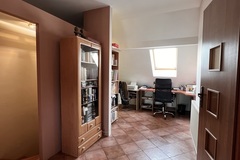 Poddasze użytkowe stanowi otwarta przestrzeń zaaranżowana na sypialnię, małe biuro oraz łazienkę z oknem.