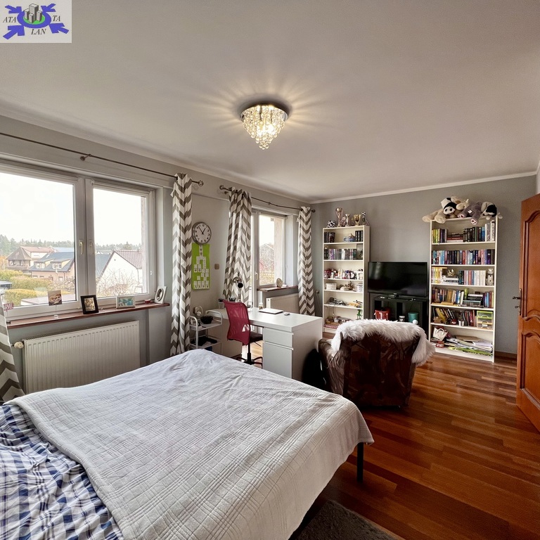 Na piętrze znajdują się łazienka z WC, 3 niezależne sypialnie oraz przedpokój z szafą w zabudowie.