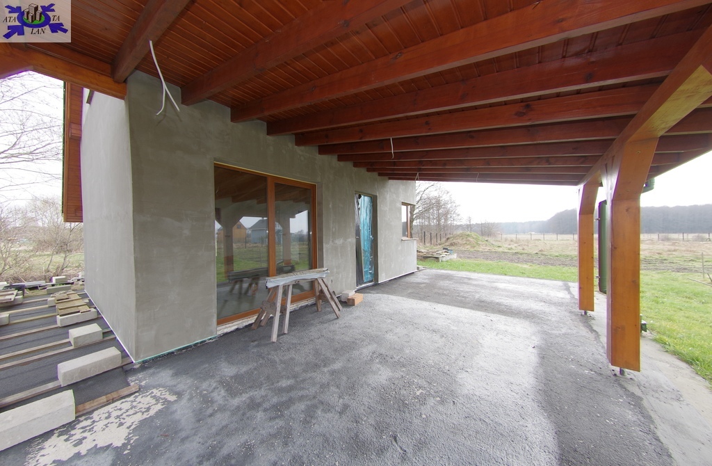 Dom pow. całkowita 70 m 2 ( 35 m 2 parter + 35 m 2 poddasze) . W części dolnej salon z aneksem kuchennym , łazienka z w c . Z salonu wyjścia na zadaszone tarasy po obu stronach domu ( wschód- zachód) . Poddasze to łazienka oraz 1 lub 2 pokoje w zależności od aranżacji i potrzeb.