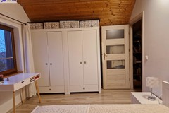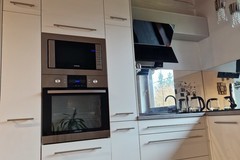 Spójna przestrzeń salon połączony z otwartą, funkcjonalną kuchnią z pełnym wyposażeniem doświetloną oknem. Kominek, z salonu bezpośrednie wyjście na taras i ogród.
