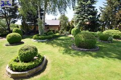 Teren ogrodzony, ładnie zagospodarowany Liczne nasadzenia ozdobne, drzewa liściaste i iglaste, kwiaty, krzewy dekoracyjne.