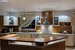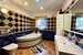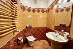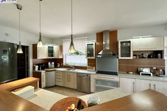 Duża kuchnia połączona z jadalnią wyposażona w meble na wymiar oraz sprzęty, takie jak zmywarka, lodówka, okap, płyta grzewcza. Na dole toaleta dla gości oraz łazienka z wanną umywalką oraz sedesem, natomiast górna łazienka z prysznicem. Ściany łazienek zostały wyłożone gresami.