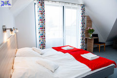 The subject of sale is a year-round service and recreation guesthouse located in the attractive seaside town of Niechorze. The guesthouse is perfectly located on the border of Niechorze / Pogorzelica, in the first line of buildings, next to the beach. It is located on a plot of area. 670 m2. Ground floor - consists of two large guest rooms, a bar, kitchen rooms, warehouses, and guest toilets. Entrance from the street on two sides and exit to the large catering garden through folding doors that span the entire width of the building. The garden can be built with a winter garden with an area of approx. 52 m2. Back room with entrance from the yard and exit to parking platforms for 8 cars located at the back of the building. 1st floor - 4 apartments for 2 people with bathrooms and terraces and one apartment for 3 people with a bathroom and terrace. Attic - 3 apartments for 2 people with bathrooms and terraces. All rooms are bright, furnished with double or single beds, wardrobes, TV and public Wi-Fi. Each room is spacious, equipped with comfortable beds, a flat-screen TV, a radio and a modern bathroom with a shower, which guarantees guests privacy and peace. The facility is heated with gas and solar panels (water). The facility was built in 2011. using the latest technologies in the field of window joinery, air conditioning, heat recovery, kitchen equipment and over the years supplemented with modern solutions serving, above all, the comfortable stay of guests.