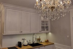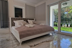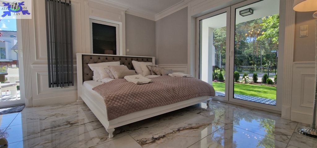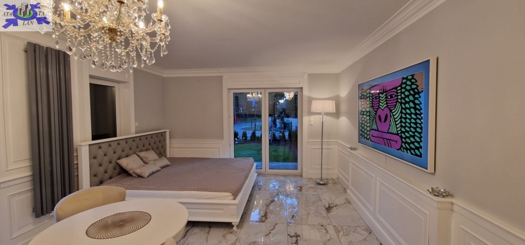 Tapicerowane niezwykle wygodne łóżko kontynentalne zostało wykonane na zamówienie. Sufity zdobią piękne, luksusowe żyrandole sprowadzone z Włoch. W kuchni znajdują się wysokiej klasy meble z pięknym drewnianym blatem oraz sprzęty renomowanej marki BOSCH. W niezwykle szykownej łazience zastosowano wielkoformatowe spieki,czyli kafle bez fug. Biały montaż luksusowej marki Villeroy&Boch, zaś armatura Hansgrohe.