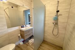 Podłogi na parterze domu pokryte terakotą, ściany wygładzone i pomalowane. Łazienka na parterze z prysznicem, w glazurze i terakocie.