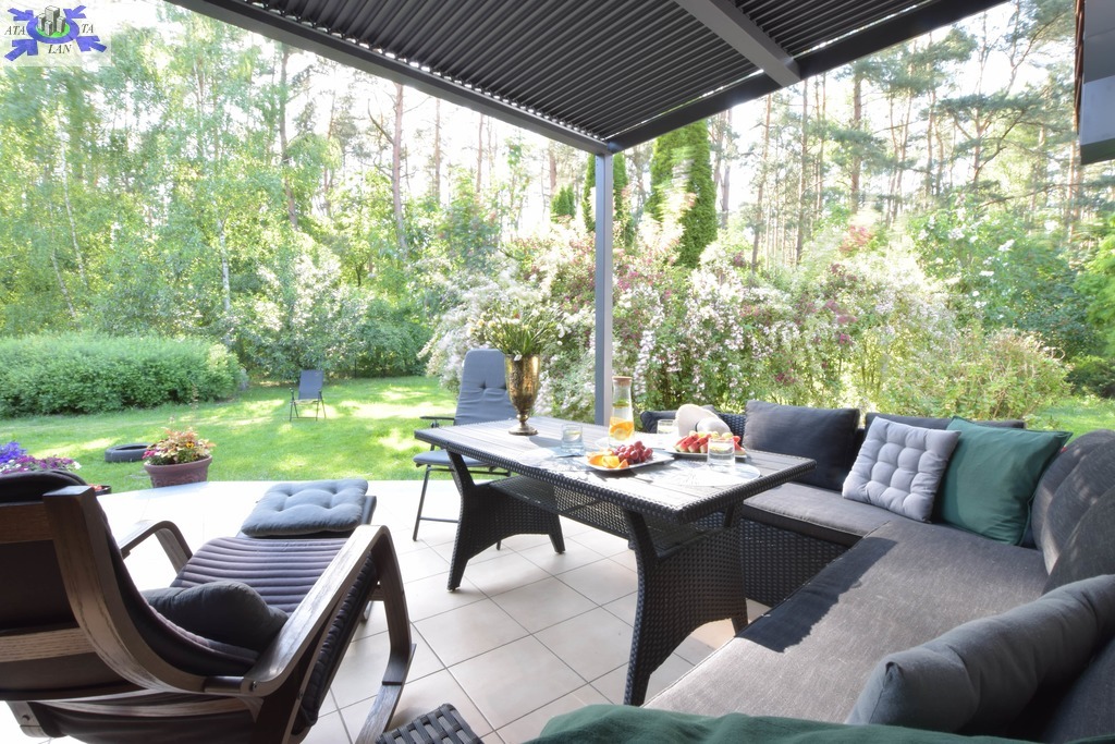 - przestronny salon o powierzchni ponad 40m2 ze ścianą okien z powalającym widokiem na ogród i ścianę lasu
