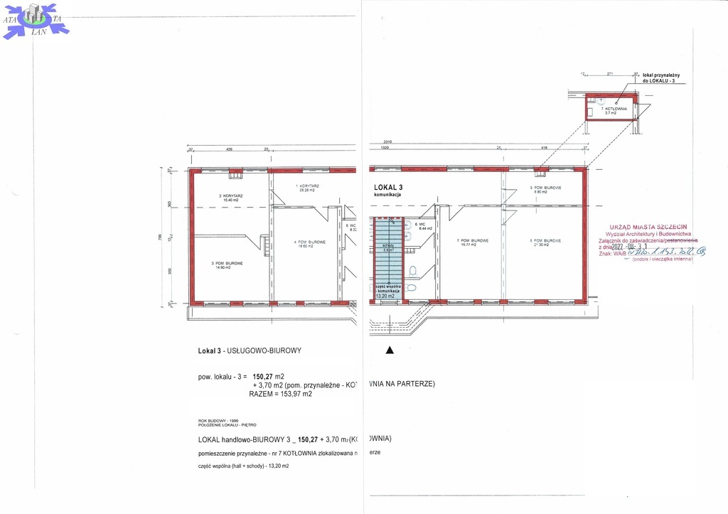 - 6 pomieszczeń biurowych o łącznej powierzchni 94,77 m2, ściany gładzone pomalowane, na podłodze panele, wykładzina biurowa i terakota.