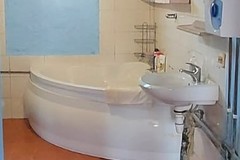 Łazienka z dużą narożna wanną, WC i umywalką, przygotowana do położenia glazury.