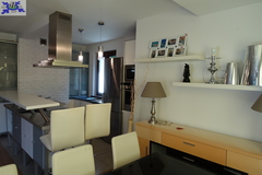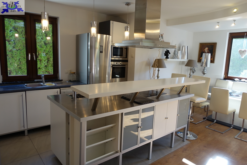 Z salonu wyjście na ogród i taras. Na podłogach panele i terakota. Meble kuchenne w zabudowie wraz ze sprzętem AGD firmy Siemens oraz Bosch lodówka z zamrażarką, zmywarka 60 cm, płyta ceramiczna, piekarnik.