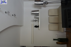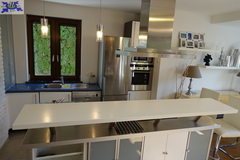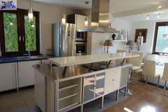 Z salonu wyjście na taras i do ogrodu. Na podłogach panele i terakota. Meble kuchenne w zabudowie wraz ze sprzętem AGD firmy Siemens oraz Bosch lodówka z zamrażarką, zmywarka 60 cm, płyta ceramiczna, piekarnik.