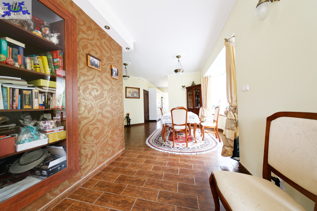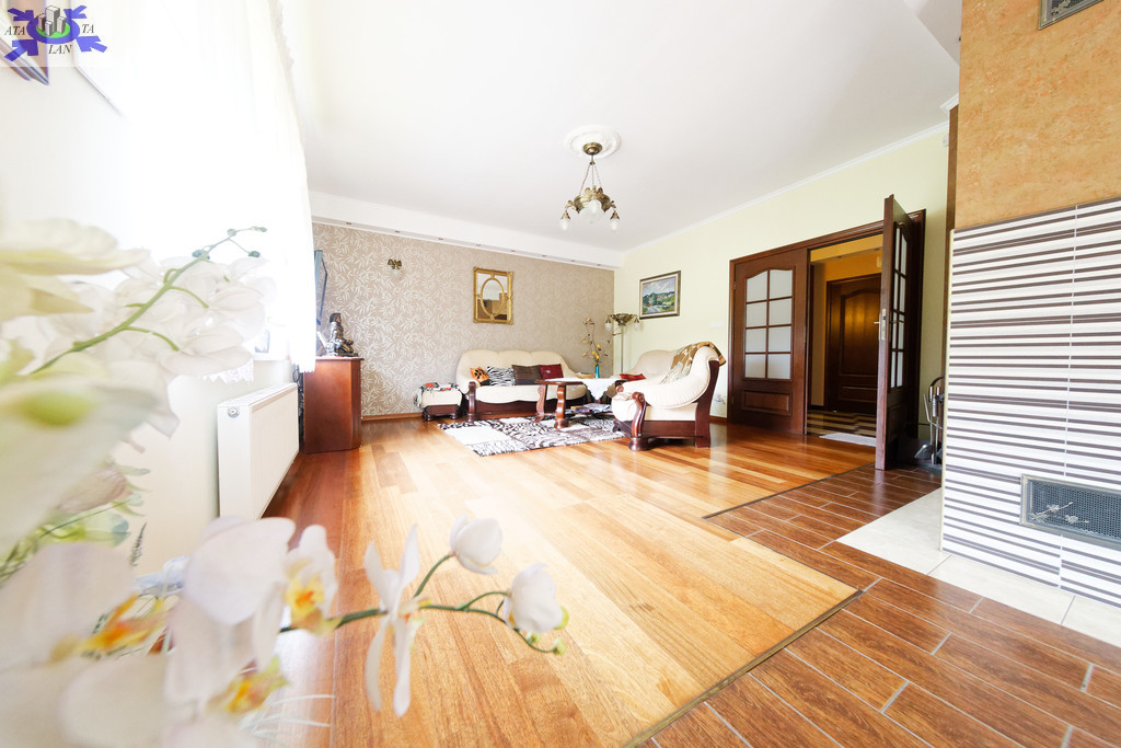 Parter Mieszkanie dla właściciela. Duży salon z kominkiem połączony z częścią biurową, jadalnią i kuchnią. Przy kuchni zlokalizowano małą spiżarnię. Korytarz, z którego jest wejście do sypialni z wewnętrzną łazienką i garderobą, toalety dla gości, salonu i jadalni oraz wejście do podwójnego garażu.