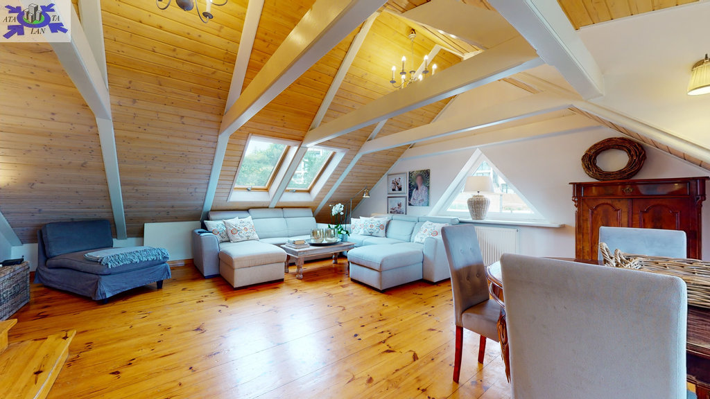 Część mieszkalną znajdującą się na piętrze i poddaszu tworzą