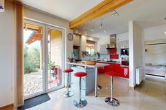 Architektura domu łączy w sobie klasyczny styl z nowoczesnymi udogodnieniami. Duże okna w salonie zapewniają niesamowite doświetlenie wnętrz i pozwalają cieszyć się widokiem na otaczającą zieleń o każdej porze dnia. Dom jest również doskonale ocieplony, co sprawia, że mieszka się w nim komfortowo zarówno zimą, jak i latem.
