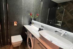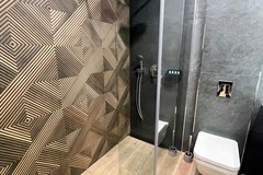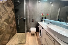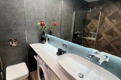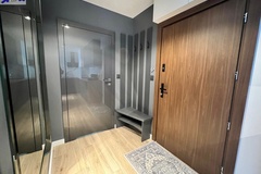 Elegancka łazienka z prysznicem, lustrem na całą ścianę i nową pralką, a także przedpokój z lustrem i wieszakami podkreślają wyjątkowość tego apartamentu.