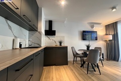 Aneks kuchenny wykonany pod wymiar wyposażony jest w nowoczesne sprzęty AGD, takie jak lodówka, zmywarka, okap i płyta kuchenna - wszystko nowe i objęte gwarancją.