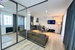 Eleganckie wnętrze zostało zaprojektowane z myślą o komforcie, a szklana ściana oddzielająca salon od części sypialnianej