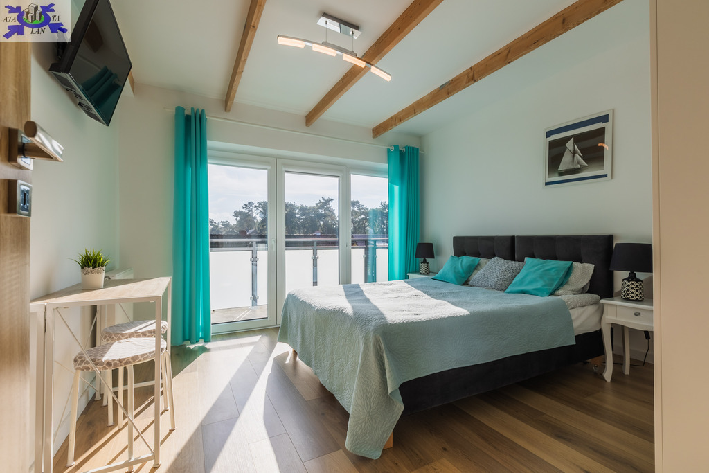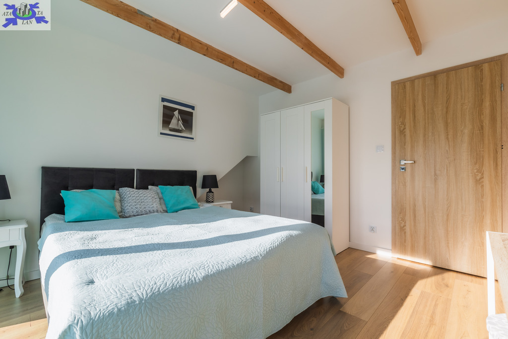 Pokoje wyposażone są w wygodne łóżka kontynentalne oraz sofy rozkładane, stoły wraz z krzesłami, szafy, tv 40 i 50 calowe.. W każdym z pokoi znajduje się także lodówka, mikrofalówka, czajnik, komplet naczyń, sprzęt plażowy.