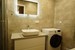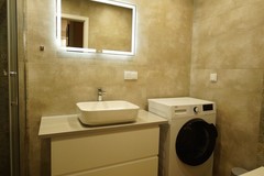 - Łazienka o powierzchni 4,4 m2 uposażona w umywalkę nad którą znajduje się podświetlane lustro, kabinę prysznicową oraz pralkę, na podłodze laminat.