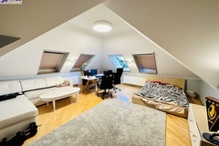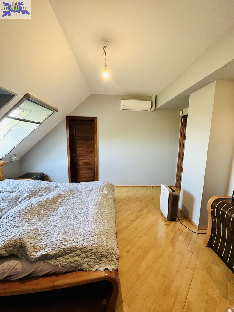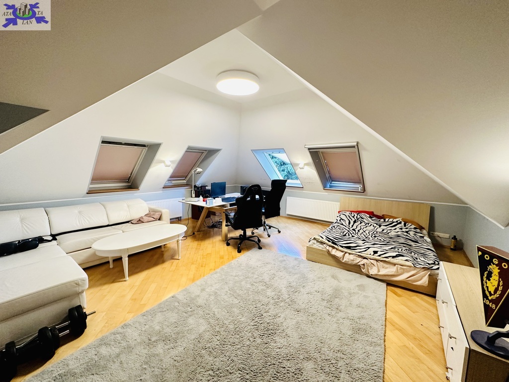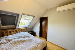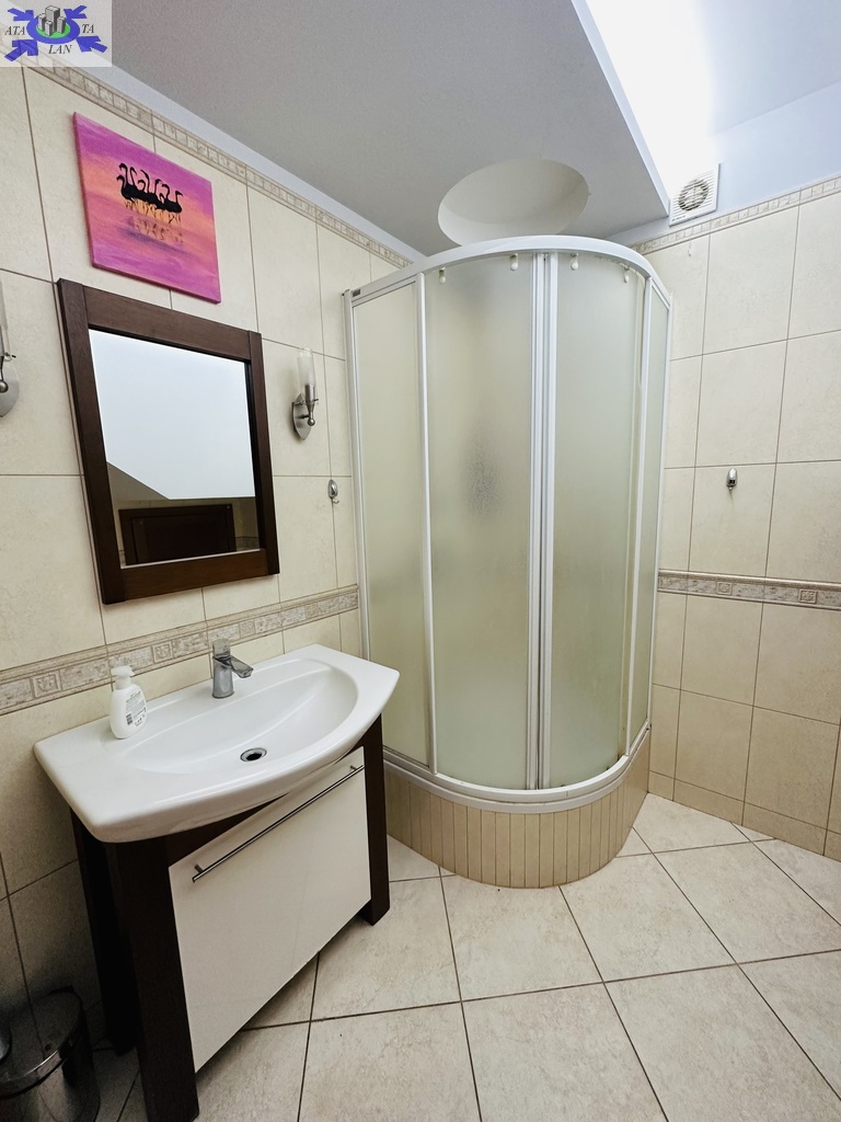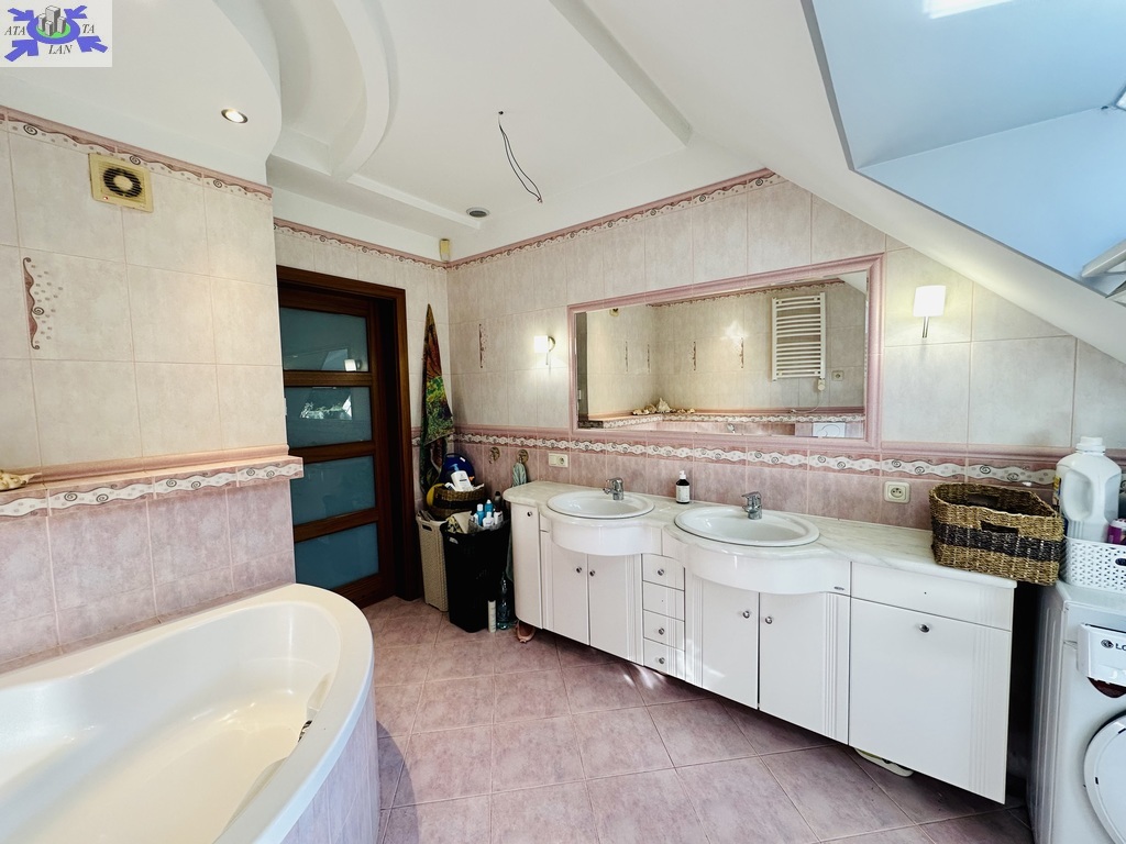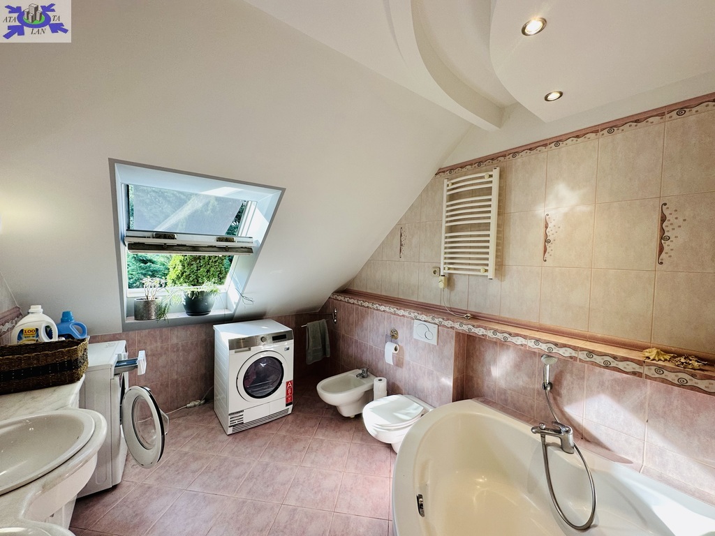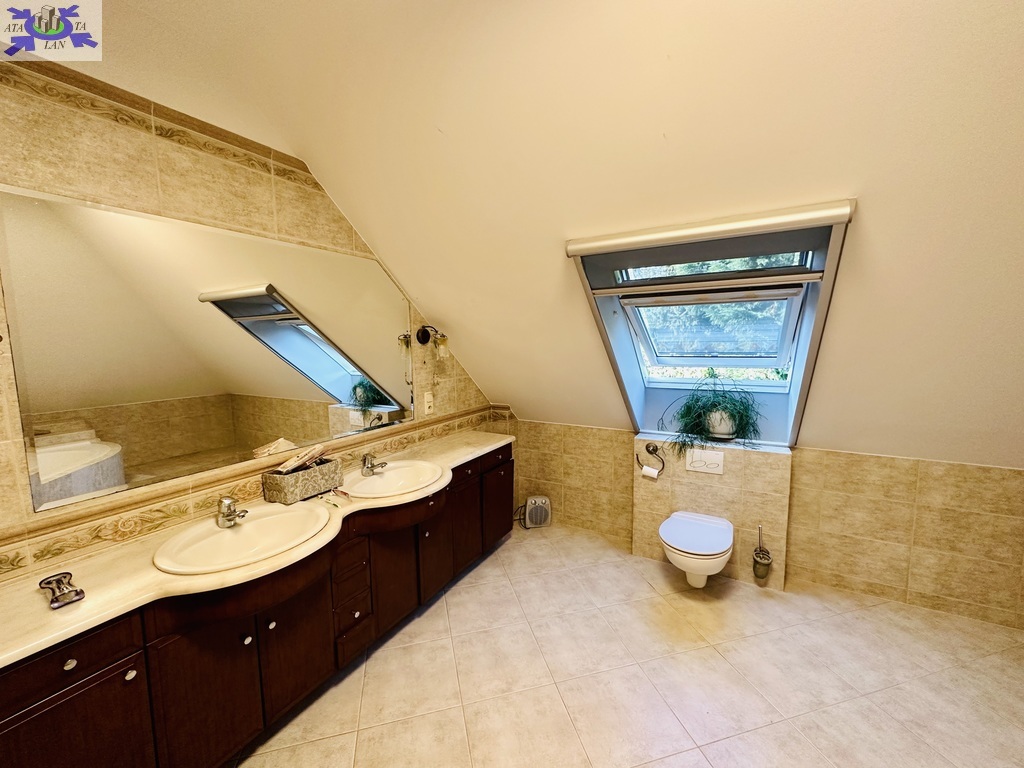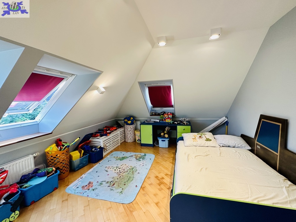 Szerokie schody prowadzą na piętro domu gdzie znajduje się 5 sypialni/ 10,74 m2, 12,86 m2, 13,68 m2, 13,95 m2, 18,85 m2/z czego jedna z sypialni ma prywatną łazienkę i garderobę. Dodatkowa łazienka z wejściem z hollu.