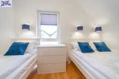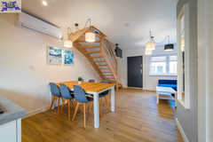 Rozkład domku - Parter Pokój dzienny (kanapa, stolik, szafa, telewizor), aneks kuchenny (w pełni wyposażony lodówka, płyta indukcyjna, czajnik, ekspres do kawy, toster, talerze, sztućce, szklanki, garnki stół z krzesłami), łazienka (kabina prysznicowa, wc, umywalka), taras (zadaszenie w formie markizy, grill, meble ogrodowe) - Poddasze Sypialnia (łóżko pojedyncze, łózko podwójne, komoda), sypialnia (łóżko pojedyncze, łóżko podwójne, komoda, szafa), toaleta. - Na wyposażeniu domków leżaki, parawany, parasole, pościel, ręczniki, dodatkowo wszystkie akcesoria dla dzieci (łóżeczka, foteliki do karmienia, nocniki, bramki zabezpieczające, nakładki wc), wózki plażowe, żelazka, deski.