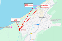 Apartamentowiec znajduje się w drugiej linii zabudowy, oddalony w linii prostej o 400 m od piaszczystej plaży.