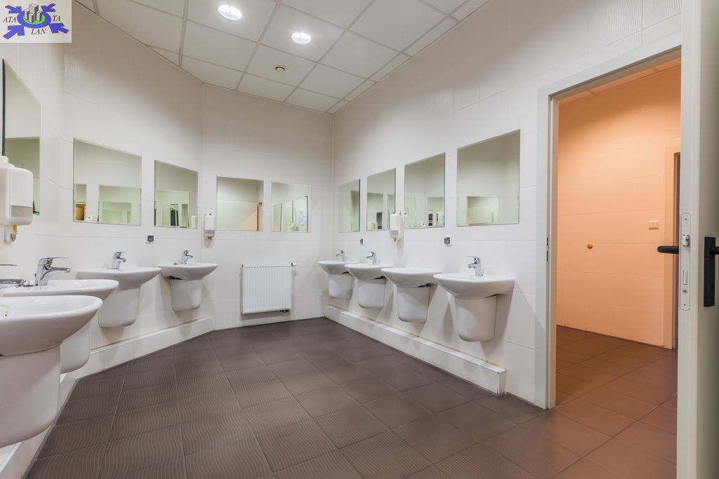 Sanitariaty 2 zbiory pomieszczeń z umywalkami, toaletami i prysznicami