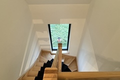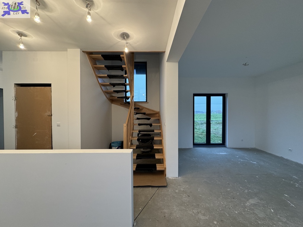 W salonie znajdują się schody prowadzące na piętro. Z salonu wychodzi się również do ogrodu.
