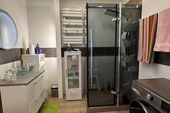 WC zostało połączone z łazienką i uzyskano ładną nowoczesną i przestronną przestrzeń, w której znalazł się prysznic z kaskadą, deszczownicą i masażami., muszla, umywalka, pralka oraz sporo powierzchni do przechowywania.