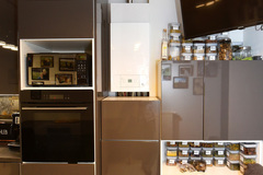 Open, window-lit , functionally designed space with built-in kitchen furniture and household appliances