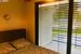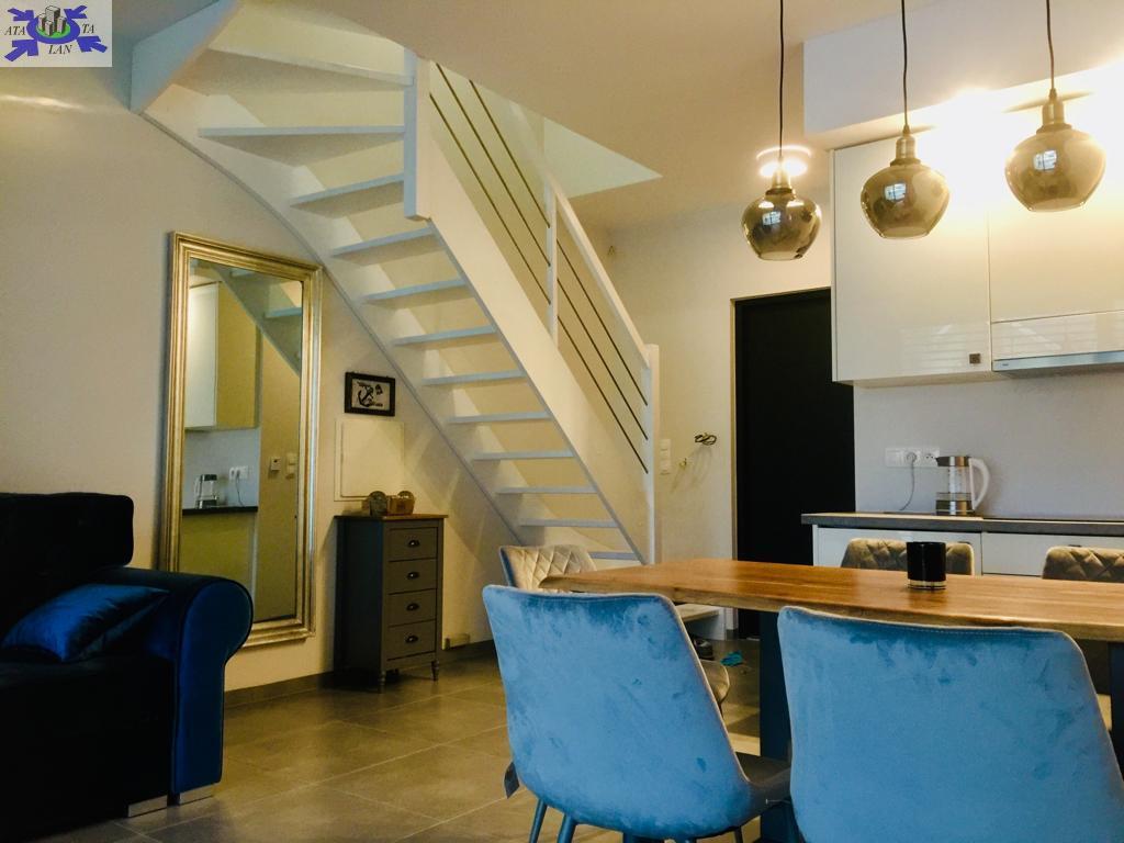 Na parterze pomieszczenia dzienne salon z aneksem kuchennym, łazienkę, przedpokój oraz drewniane schody prowadzące na 2 poziom. Z salonu wyjście na taras. Doskonałe doświetlenie wnętrza zapewniają duże, bezprogowe okna podłogowe, a dla zapewnienia odpowiedniej prywatności automatycznie sterowane żaluzje oraz system alarmowy. Ogrzewanie podłogowe gazowe na całej powierzchni apartamentu. Drzwi zewnętrzne i wewnętrzne drewniane.