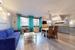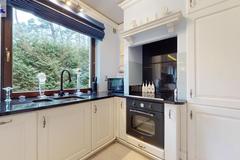 -Salon z kominkiem i aneksem kuchennym z dużymi oknami antywłamaniowymi wychodzącymi na zieleń ogrodu
