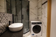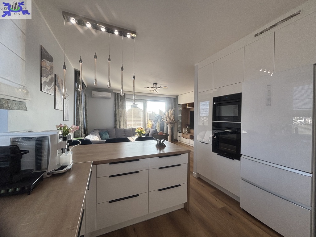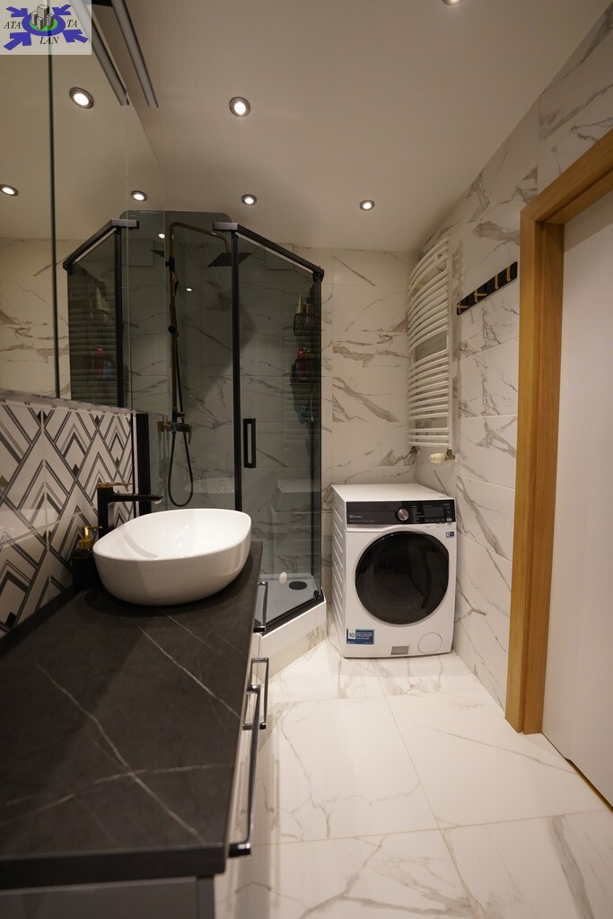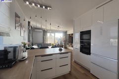 W kuchni zabudowa na wymiar, wyposażona w sprzęt AGD ( zmywarka, okap, płyta indukcyjna, lodówka, piekarnik . Dodatkowo pomiędzy częścią wypoczynkową, a kuchnią, zamontowano bardzo duży i wygodny barek.