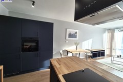 - pokój z aneksem kuchennym. Część kuchenna w nowoczesnej zabudowie z wyspą. Na wyposażeniu płyta indukcyjna, zmywarka, piekarnik, zlew, lodówka z zamrażarką.
