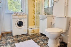 W łazience umieszczono bojler na wodę oraz piec na paliwo stałe - ogrzewającym dom i ciepłą wodę.