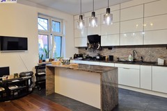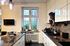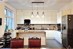 * kuchnia z meblami w zabudowie na wymiar koloru białego z granitowymi blatami i wyspą, wyposażona w sprzęt AGD piekarnik, lodówkę z zamrażarką, płytę gazową, okap z wyciągiem oraz zmywarkę. Kuchnia to przestronne i jasne pomieszczenie połączone z jadalnią, gdzie obecnie znajduje się duży drewniany stół z 6 krzesłami.