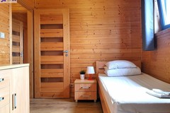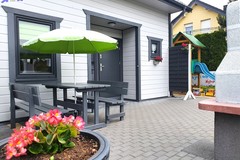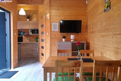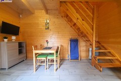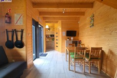 Budynek podzielony jest na 4 części, z których każda składa się z salonu z aneksem kuchennym i łazienką (parter) oraz dwóch sypialni (piętro). W każdym module może tu wygodnie wypoczywać 6 osób, a do ich wyłącznej dyspozycji na zewnątrz znajduje się stół piknikowy oraz grill betonowy. Dodatkowo na terenie posesji znajdziemy kącik zabaw dla dzieci oraz rowery.