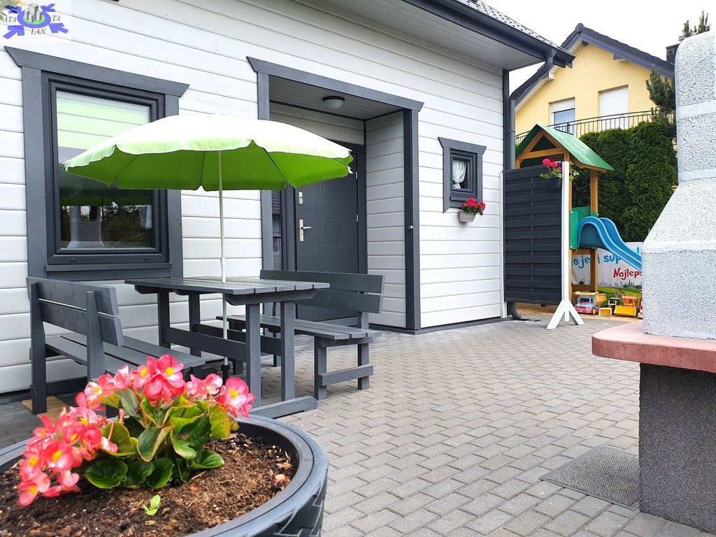 Fundamenty wykonane są z bloczków i dodatkowo docieplone. Dom jest z drewna, dach z blacho-dachówki, poza tym teren wyłożony jest kostką brukową i ozdobiony licznymi nasadzeniami. Podłączenie do deszczówki gminnej. Drzwi antywłamaniowe, okna PCV.