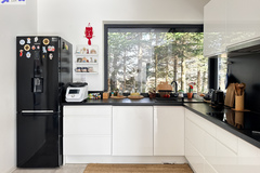 Na dzienną powierzchnię domu składają się przestronny, dobrze doświetlony salon z kominkiem i aneksem kuchennym, a także małą, ale jakże niezbędną spiżarnią.
