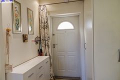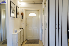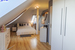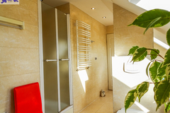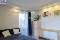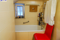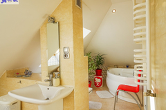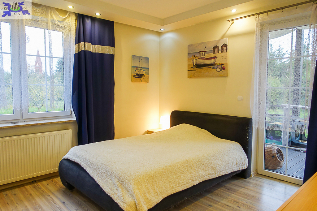 PIĘTRO ze skosami pokój o powierzchni użytkowej 11,63 m2 po podłodze około 20 m2 i sypialnia po podłodze ok. 20 m2 z wejściem do garderoby, i pomieszczenie gospodarcze. Łazienka 4 m2 po podłodze ok. 10 m2 w niej wanna narożna, kabina prysznicowa, umywalka WC razem. W łazience okno, jasna glazura i terakota, średnie rachunki za energię elektryczną 600 zł.