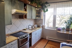 kuchnia z oknem, z jadalnią o pow. ok. 12 m2, bardzo jasna, z meblami starszego typu, na podłodze deski, ściany gładzone malowane (od strony ulicy - wschód),