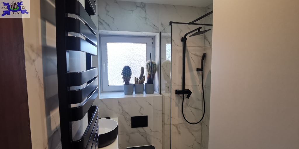 łazienka z oknem, o pow. ok. 3,5 m2, z kabiną prysznicową, umywalką i wc (remont 6 lat temu),
