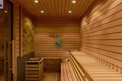 Wspólny basen i wykończona sauna, solarium na dachu z grillem.