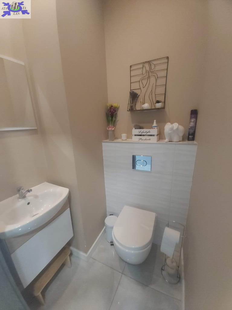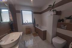 Przestronna łazienka z wc, wyposażona zarówno w wannę, jak i prysznic, co gwarantuje wygodę użytkowania.
