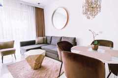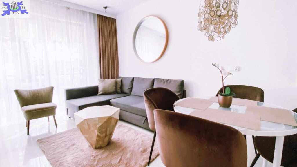 W apartamencie zastosowano wysokiej jakości materiały wykończeniowe - w salonie i łazience położono białą glazurę, natomiast w sypialni podłogę drewnianą. Mieszkanie jest w pełni umeblowane i wyposażone, co czyni je gotowym do zamieszkania lub natychmiastowego wynajmu.