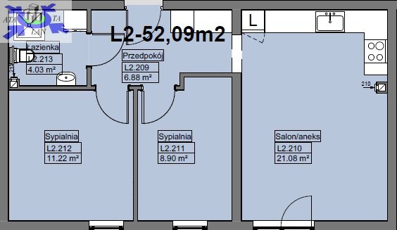 - salon z aneksem kuchennym - pow. 21,08 m2,