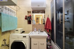 * łazienka z kabiną prysznicową, umywalką i pralką oraz osobno WC z umywalką